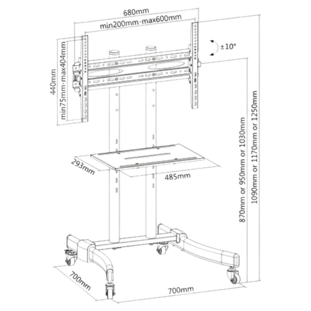 Stojan je mobilní, pojezd zajišťují kolečka s brzdou pro zajištění v požadované poloze. V balení naleznete polici. Police je výškově nastavitelná. Nastavení výšky obrazovky v 5 pozicích. Stojan na LCD a LED televizory je s podporou VESA standardu 200x100 až 600x400, proto je vhodný pro zavěšení obrazovek s úhlopříčkou 32 až 70". Náklon obrazovky +10° až -10°. Maximální zatížení je až 50 kg.